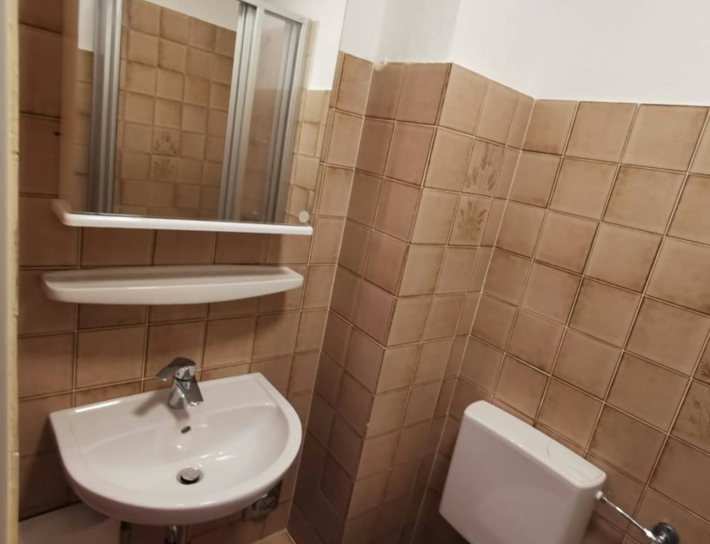 The kitchenette and the bathroom can be reached via the hallway. The kitchen is freshly tiled and is equipped with a cooker and a refrigerator. Particularly noteworthy is the large window, which faces the quiet backyard. The two windows of the flat have been renewed in January 2021 and meet the latest standards. The floor in light wood optics is also freshly laid.