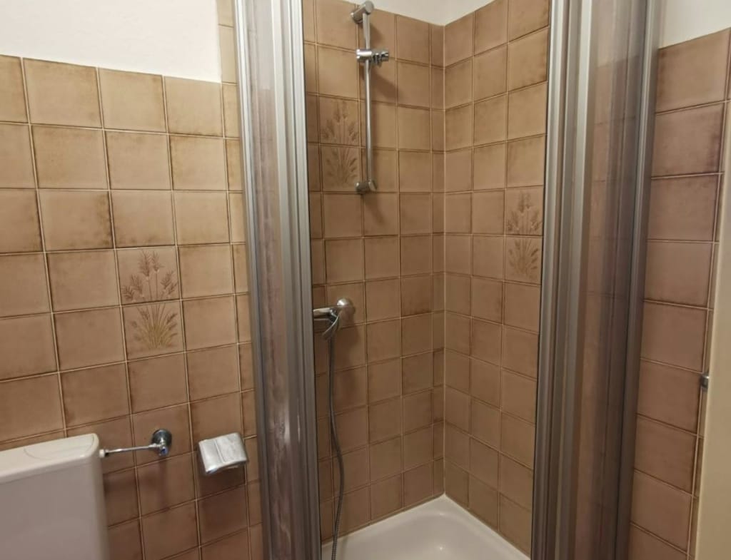 The small bathroom has a shower, an illuminated mirror and its own washing machine connection for a toploader. There is also a ventilation filter.