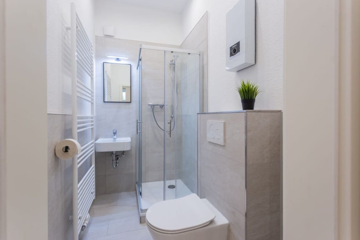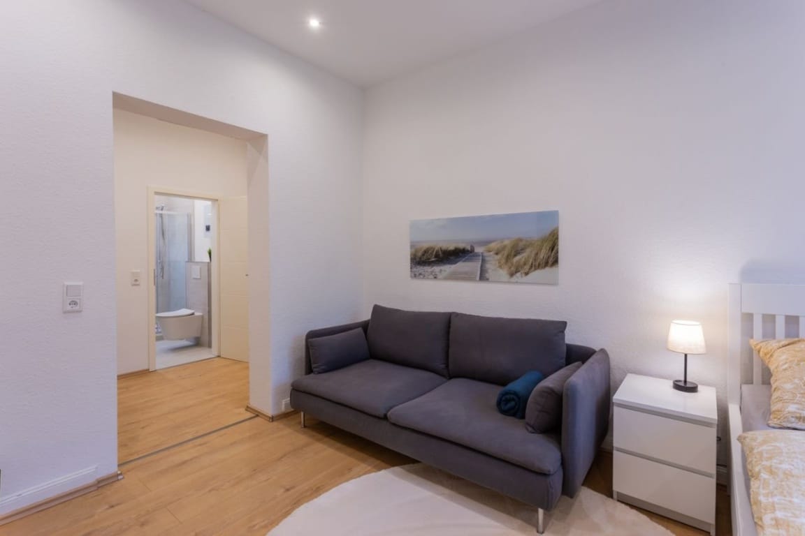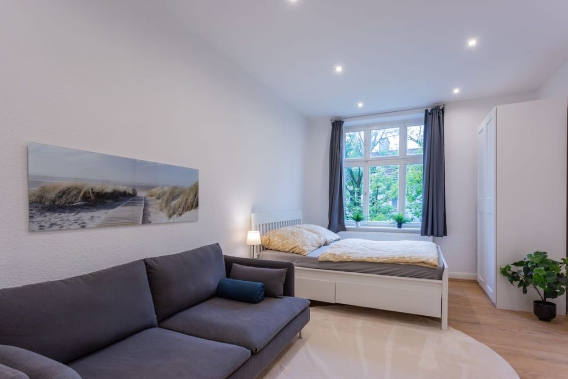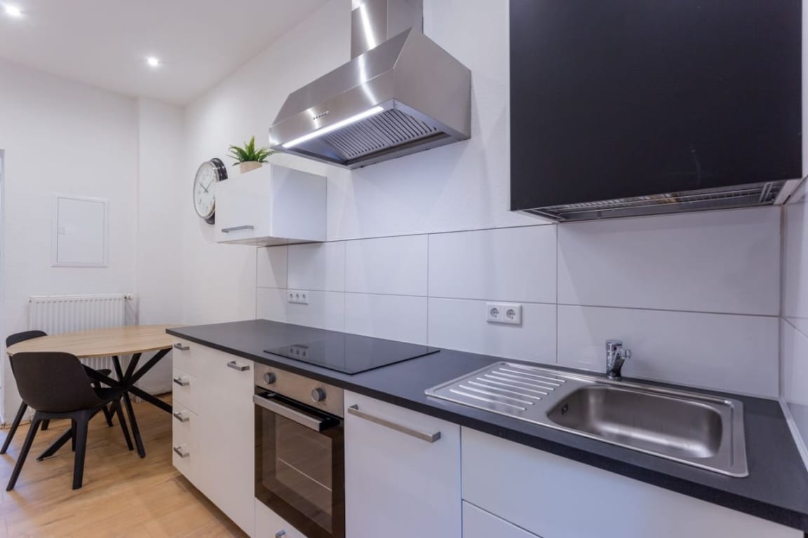 This high-quality, recently renovated one-bedroom apartment features a modern design. It features an open-plan living and sleeping area, a modern bathroom, and a fully equipped kitchen, offering all the comforts for a pleasant stay. The spacious living/sleeping area is ideally furnished with a comfortable sofa, a modern smart TV, and a dining table with two chairs. The modern kitchen is another highlight of the apartment. It is equipped with a high-quality refrigerator/freezer, a ceramic hob, and an elegant sink. For additional convenience, a washing machine is available in the shared laundry room. The central location offers excellent infrastructure, making the apartment particularly suitable for young professionals and students. The university, numerous shops, cafés, restaurants, and public transport stops are in the immediate vicinity.